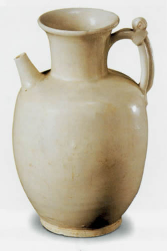 白瓷首創于隋代,成熟于唐代,唐人曾稱頌當時制造的白瓷說:“大邑燒瓷輕且堅,好似美玉天下傳。君家白碗盛霜雪,急送茅齋也可憐?!碧茣r白瓷的制作工藝可謂高超之極。然而,這件白瓷執壺雖也精致非常,但與美玉相比似乎還差得很遠,可能是唐代平民所用之器,并非唐時白瓷燒造的最佳水平。